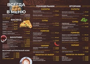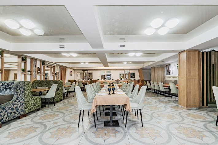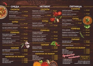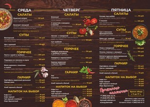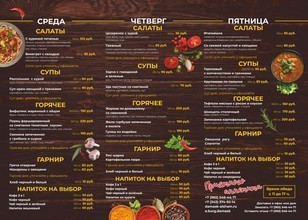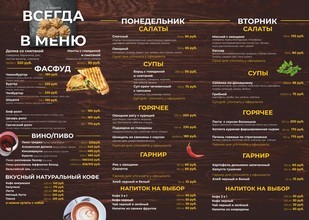 В меню вы найдёте изобилие блюд, которые готовят профессиональные повара по традиционным рецептам восточной, русской и европейской кухни в авторском прочтении. Вас поразит изысканное сочетание свежих продуктов и ароматных специй. Если вы не сильно голодны, то закажите закуски или салаты из спелых овощей и зелени. Как следует подкрепиться можно супом на наваристом бульоне и аппетитным горячим из птицы, мяса или рыбы.